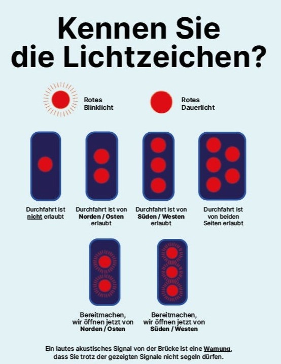 På broen findes et digitalt lysdisplay, som viser, hvornår næste broåbning kan forventes.
