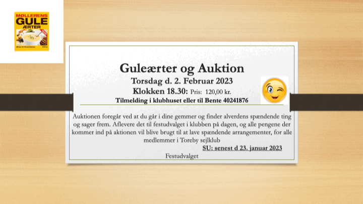 Forslag til generalforsamlingen skal være formanden, Palle Tørnqvist, Hjelm Byvej 22, 4990 Sakskøbing, i hænde pr. e-post - pt@c.dk - eller brev senest 7. februar 2023. Endelig dagsorden og regnskab vil være fremlagt i klubhuset senest 20. februar 2023. Stemmeret på generalforsamlingen har aktive medlemmer af Toreby Sejlklub, indmeldtsenest tre måneder forud for generalforsamlingen, og som ikke er i restance.