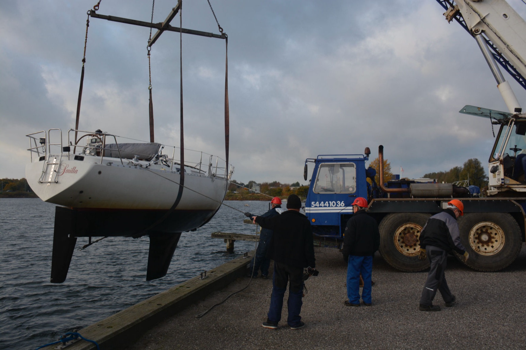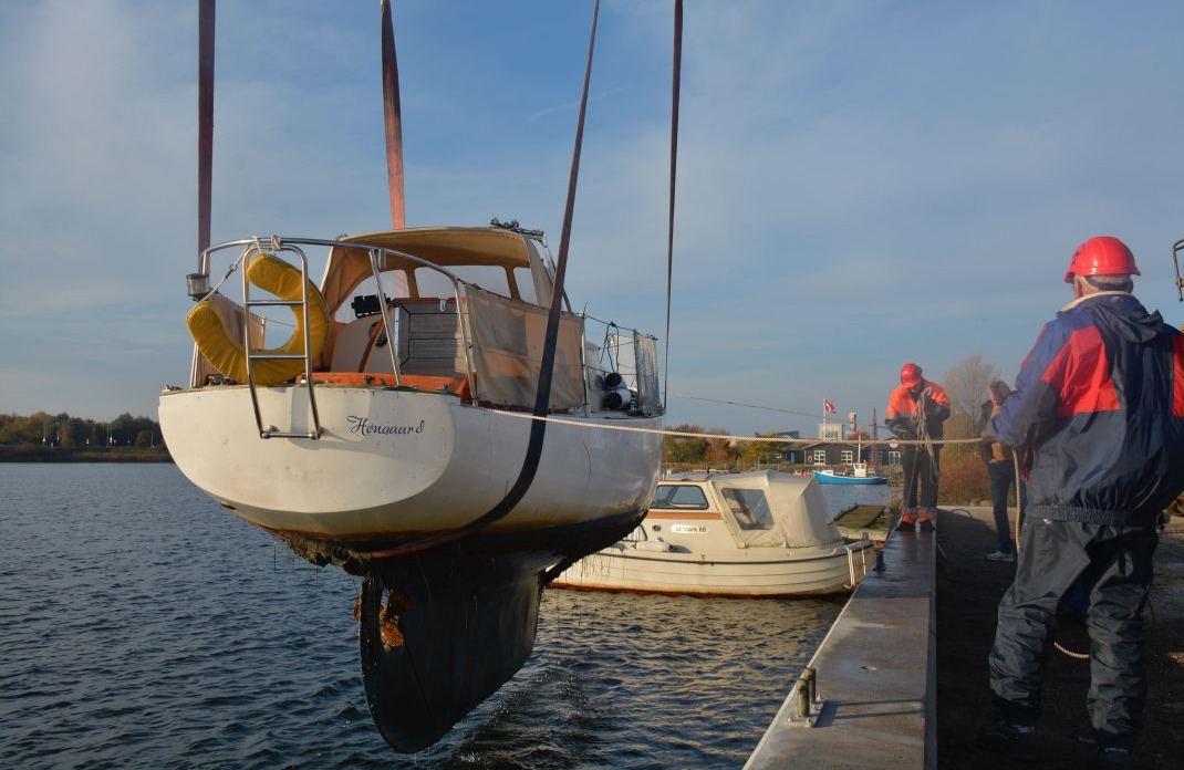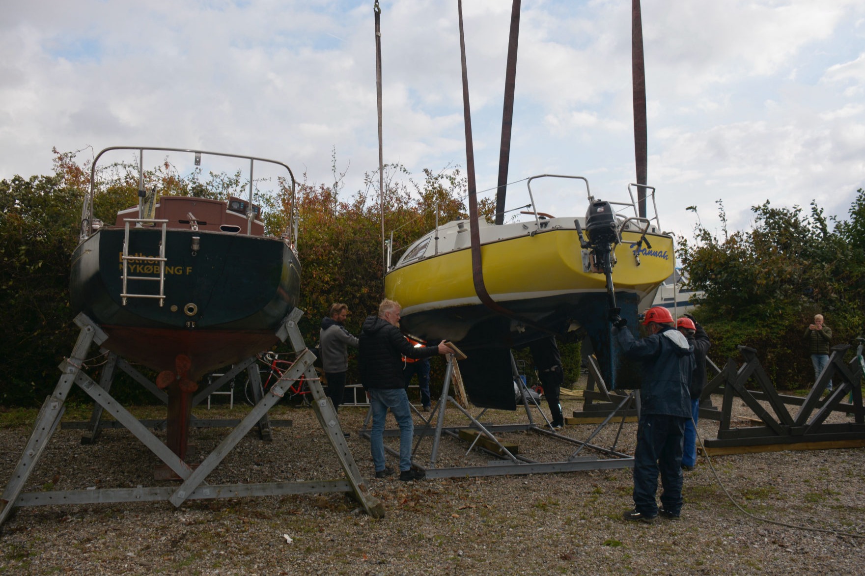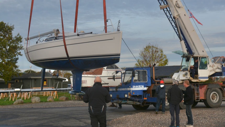 En kort regnbyge indledte optagningerne lørdag den 8. oktober, men sommeren indfandt sig op ad dagen med sol og 15 grader og fortsatte søndag. Hans Lund, Torsten Gandsager, Karsten Reitz-Hansen og Jan Krogh udgjorde arbejdsholdet. Ca. 45 både skal op land i løbet af weekenden. Et tilsvarende antal både er tilmeldt optagningerne 29. og 30. oktober. Billedet viser Jim Hansens "Ronja", netop løftet op af vandet.