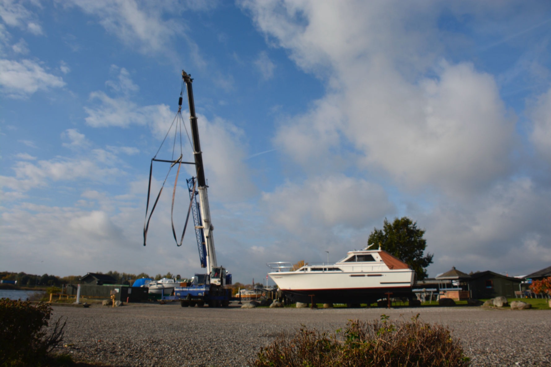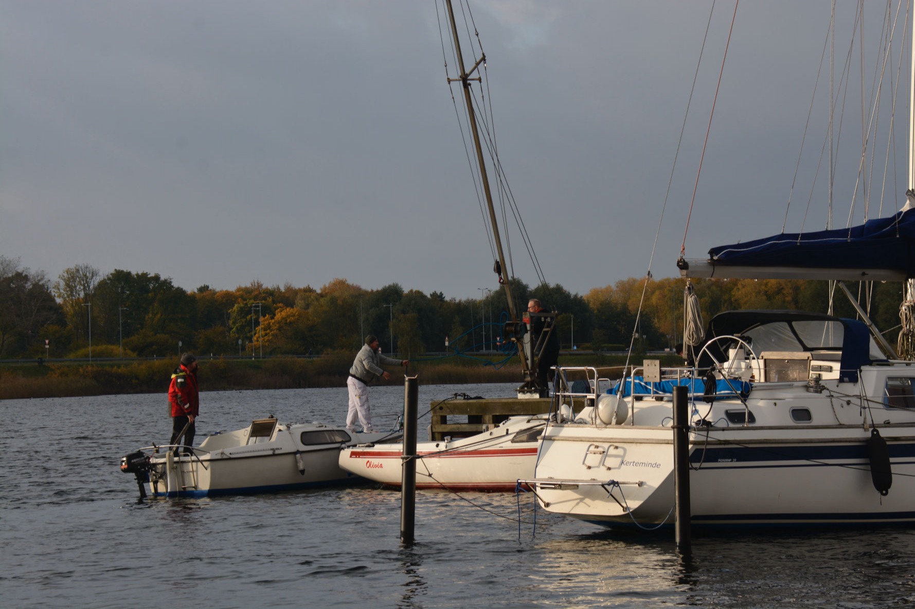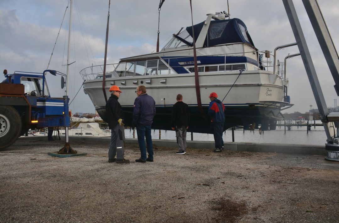 En kort regnbyge indledte optagningerne lørdag den 8. oktober, men sommeren indfandt sig op ad dagen med sol og 15 grader og fortsatte søndag. Hans Lund, Torsten Gandsager, Karsten Reitz-Hansen og Jan Krogh udgjorde arbejdsholdet. Ca. 45 både skal op land i løbet af weekenden. Et tilsvarende antal både er tilmeldt optagningerne 29. og 30. oktober. Billedet viser Jim Hansens "Ronja", netop løftet op af vandet.