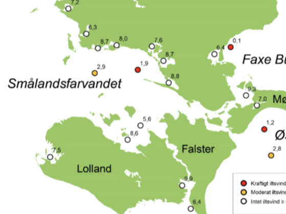 "I Smålandsfarvandet opstod der også iltsvind i slutningen af sidste rapporteringsperiode. Iltsvindet fortsatte ind i denne periode, men forsvandt i den østlige del af farvandet i starten af september. Midt i september var der moderat og kraftigt iltsvind i henholdsvis den vestlige og østlige del af farvandet. Ilt- svindsmodellen angiver, at arealet påvirket af kraftigt iltsvind var meget lille, mens der var udbredt moderat iltsvind i et område hovedsageligt syd for de to overvågningsstationer i området"