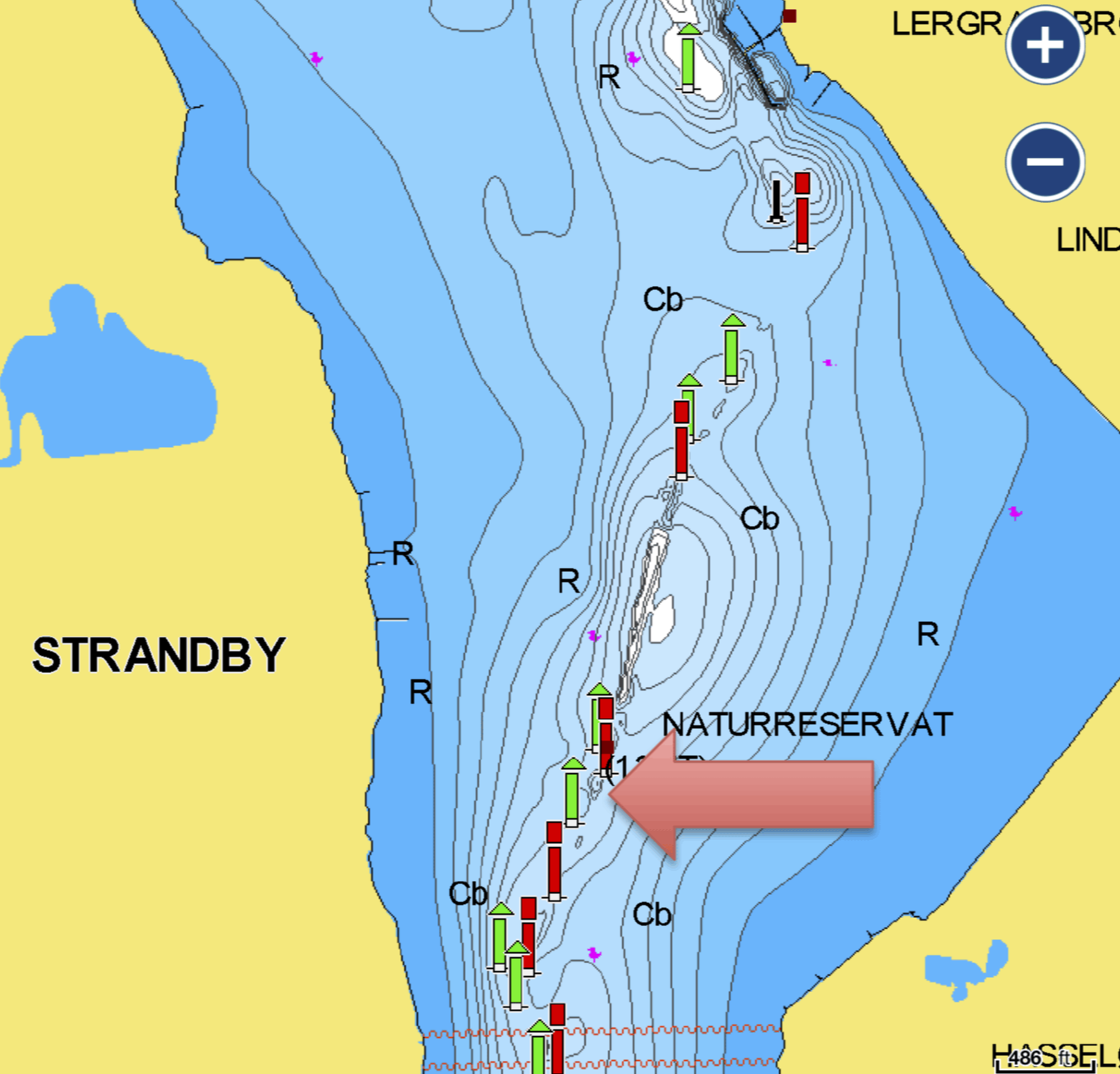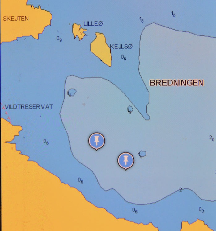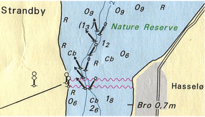På digitale søkort - for eksempel "Krak til søs" - over Guldborg Sund angives lave dybder (1,3 m) vest for Hasselø, WGS84 54.44.40.6N - 11.52.15.4E.