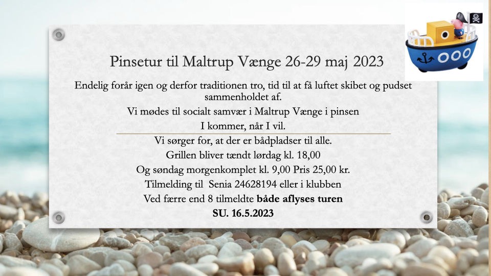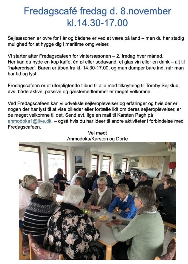 Vi sejler ud om formiddagen og gør et stop i Guldborg, hvor vi nyder en fælles frokost. Når vi vender hjem til klubben, venter der kaffe og kage som en velfortjent afslutning på en forhåbentlig dejlig dag.