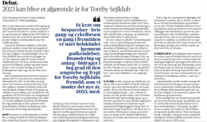 Broen projekteres i 2023 med broklap forud for ansøgning om Kystdirektoratets godkendelse. Hent debatindlægget (pdf)