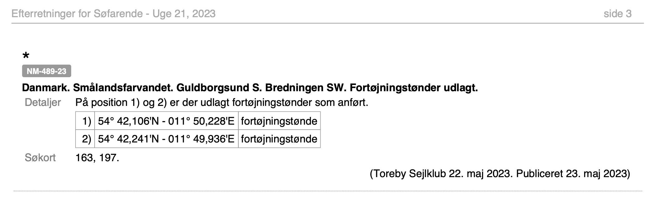 De angivne positioner er de godkendte af Kystdirektoratet. Udlagte bøjers positioner varierer en smule.