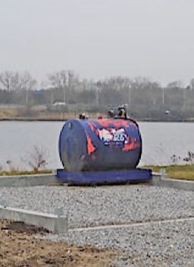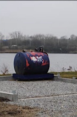 Spildolietanken, fotograferet i foråret 2013, opstillet på fundamentet til den nye affaldsgård.
