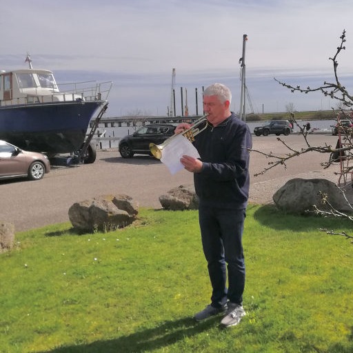 Efter vi har halet standeren op sammen med Dannebrog, har Jørn Bonde lovet at spille på trompet, mens vi synger en enkelt sang, som vi plejer.