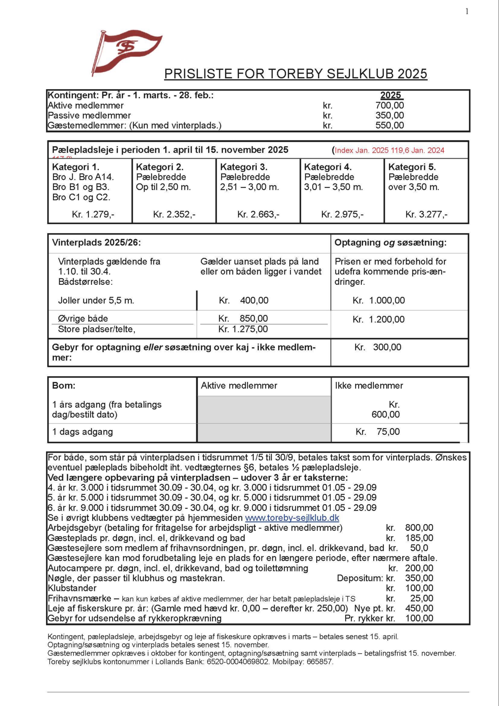 PRISLISTE FOR TOREBY SEJLKLUB 2025