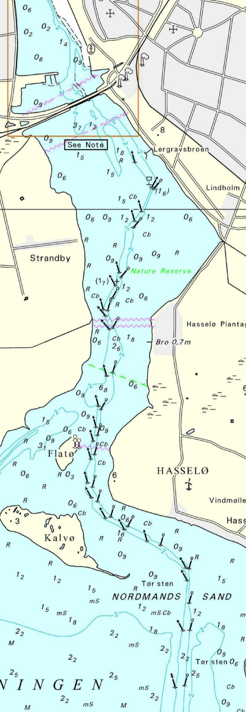 In der Hjelms Rende und in dem Fahrwasser bei Nykøbing beträgt die maximale Geschwindigkeit 5 Knoten.